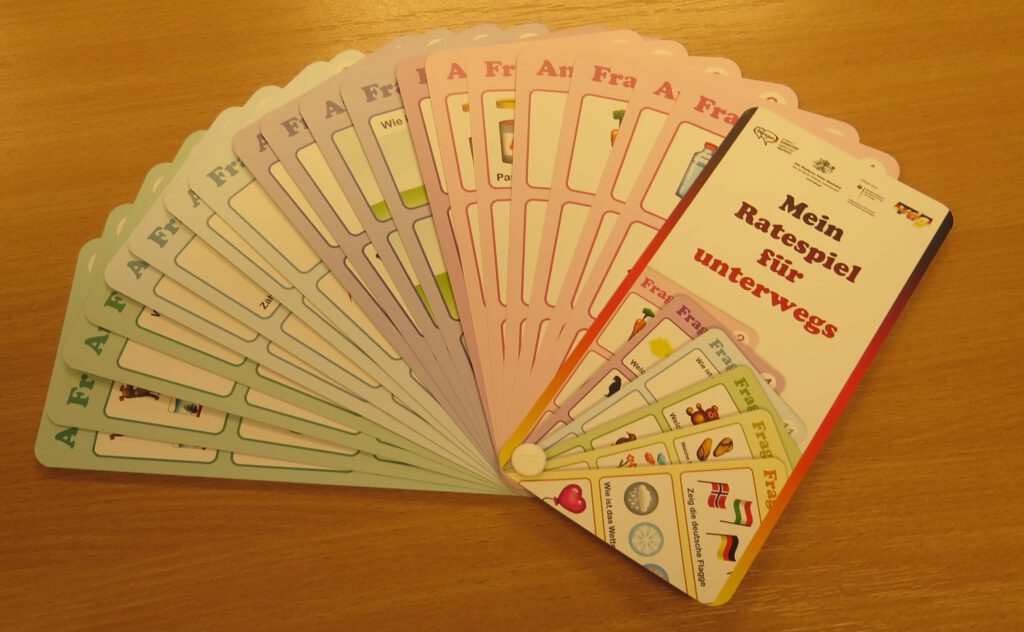 Mein kleines Ratespiel für unterwegs ist ein weiteres Angebot für Kinder von 3 bis 5 Jahren. Das Spiel ist im Taschenformat und eignet sich für unterwegs zum Beispiel im Auto oder zu Ausflügen. Es enthält 24 Karten und auf jeder Karte befinden sich drei Fragen für die Jüngsten und auf der Rückseite – die Antworten, ebenfalls mit Bildern. Es fördert nicht nur das Deutschlernen sondern auch das logische Denken und das Beobachtungsvermögen. Das Ratespiel ist im HDPZ kostenlos erhältlich.