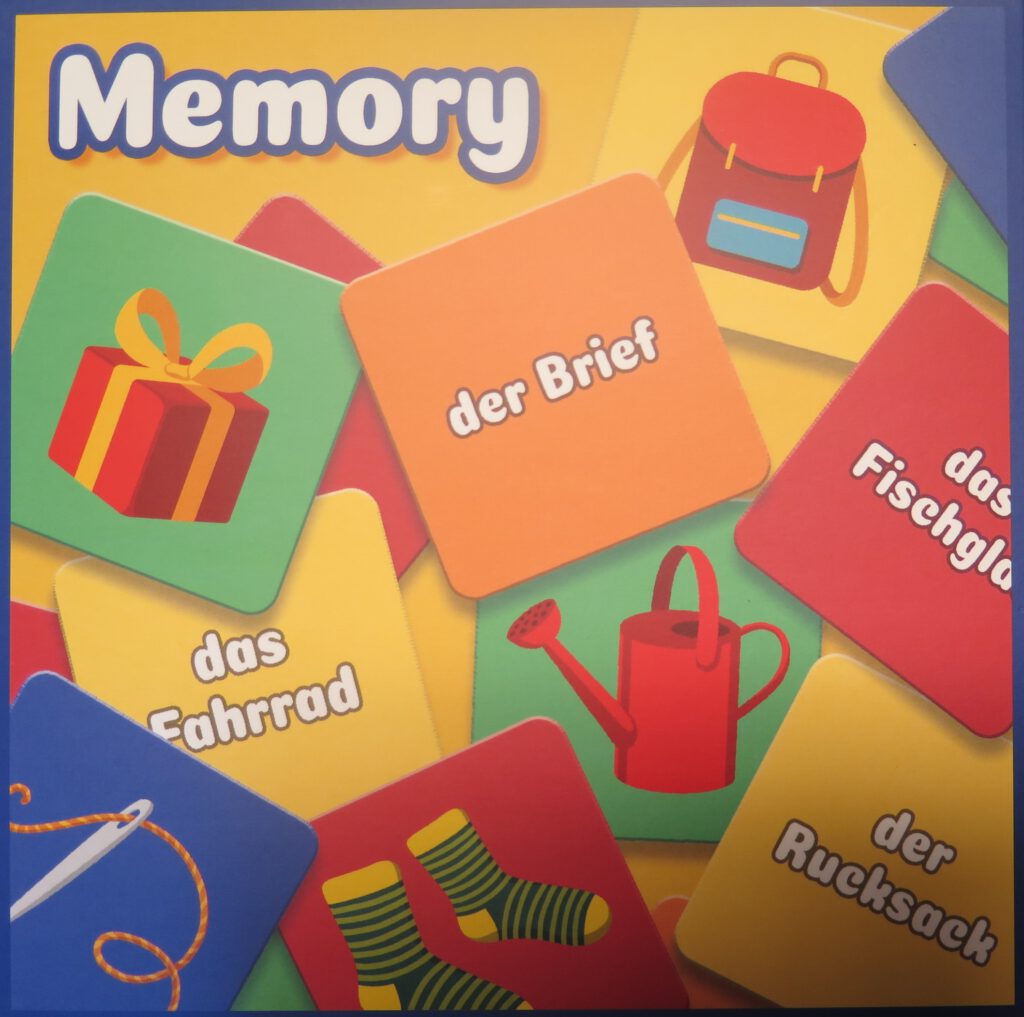 Das Memory- Spiel ist ein logisches Spiel, das nicht nur den Kindern und den Jugendlichen aber auch den Erwachsenen, die Deutsch lernen, gewidmet ist. Das Spiel besteht aus Karten mit Zeichnungen der Grundbegriffe und ihren Unterschriften mit entsprechenden Artikeln. Es erleichtert das Lernen des Wortschatzes und entwickelt Gedächtnis und Konzentration. Das Memory-Spiel ist in unseren Büros verfügbar.